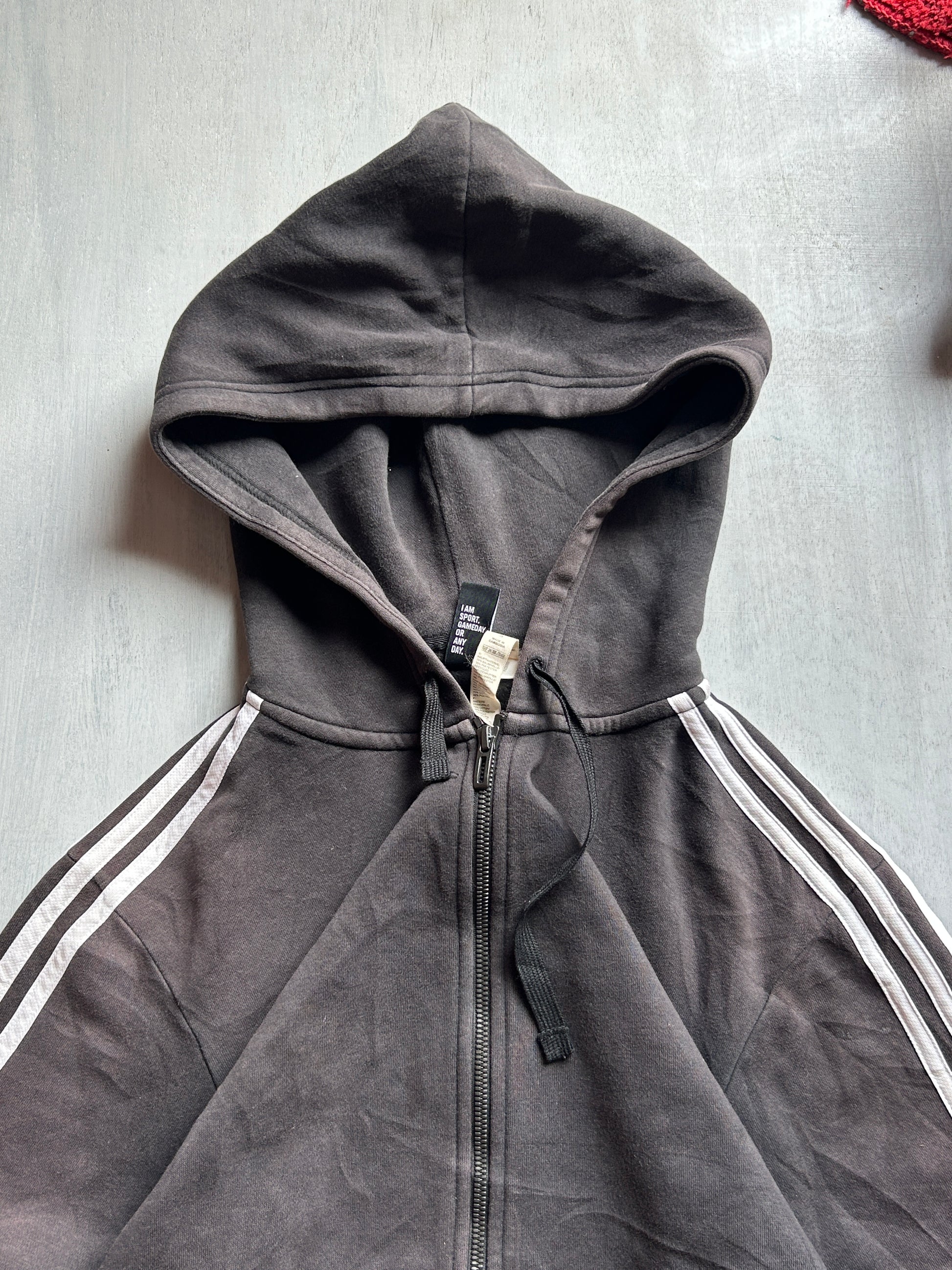 This black zip-up hoodie features bold contrast stripe detailing along both sleeves, giving it a clean athletic-inspired look. The structured silhouette and minimal front design make it a versatile layering piece for casual and streetwear outfits.