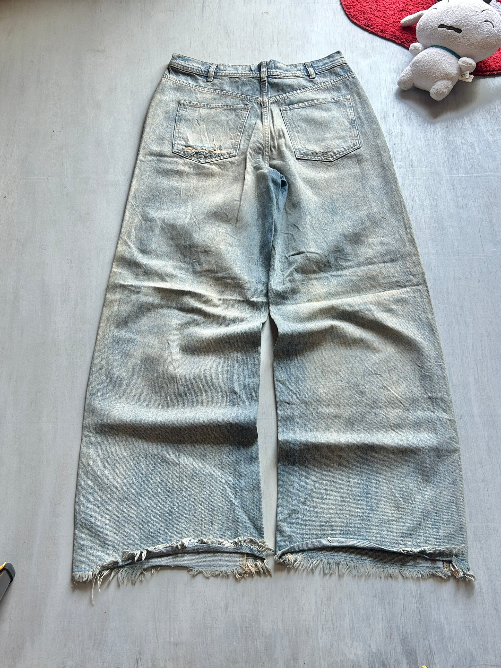 Make a bold statement with these light blue heavy distressed jeans featuring dramatic ripped detailing on both legs. Designed in a wide-leg silhouette with a relaxed fit, these jeans bring a strong streetwear edge while keeping the classic denim structure. The vintage faded wash enhances the rugged, worn-in look.